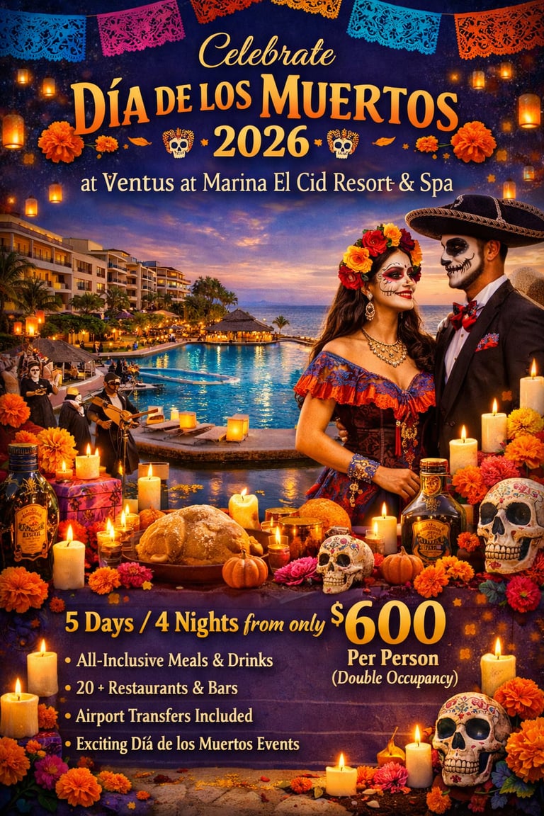 Join us for an unforgettable Día de los Muertos experience in Mexico, set at the stunning Ventus at Marina El Cid Resort & Spa. This intimate, small-group getaway is designed for travelers who want to experience the culture and celebration at their own pace, with optional activities and plenty of time to relax, indulge, or explore.