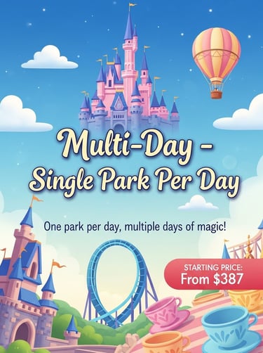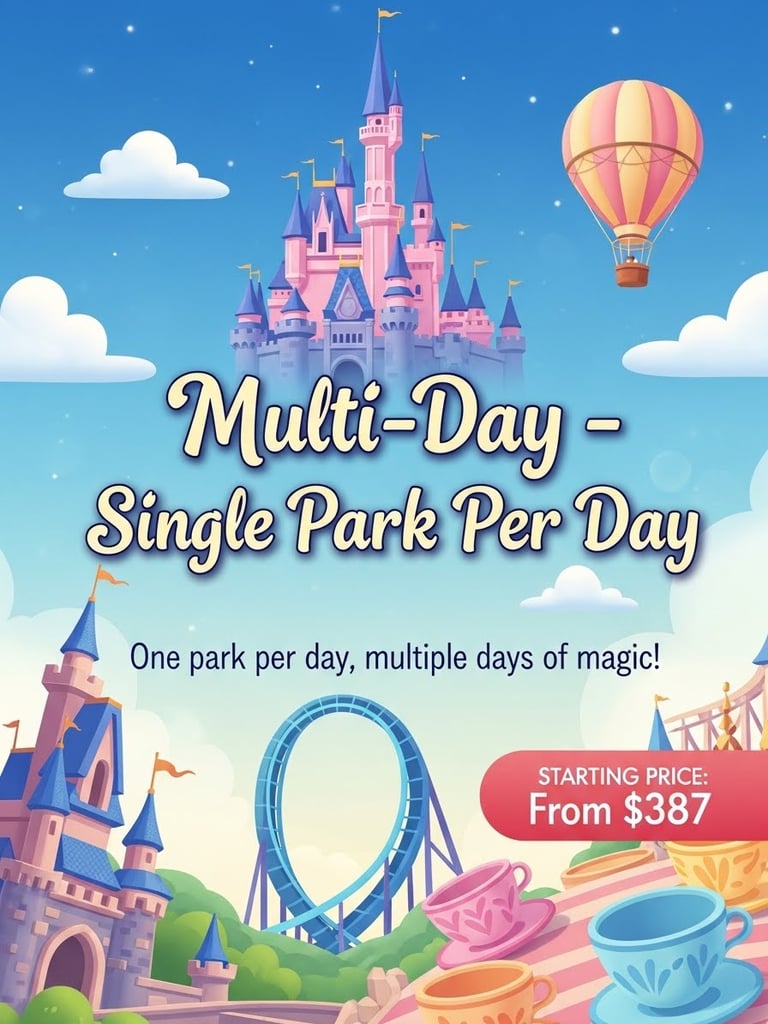 Spread your Disney adventure over 2–7 days, visiting one park per day. Includes admission to one park each day, transportation between parks, and full access to attractions and shows. Starting at $387.